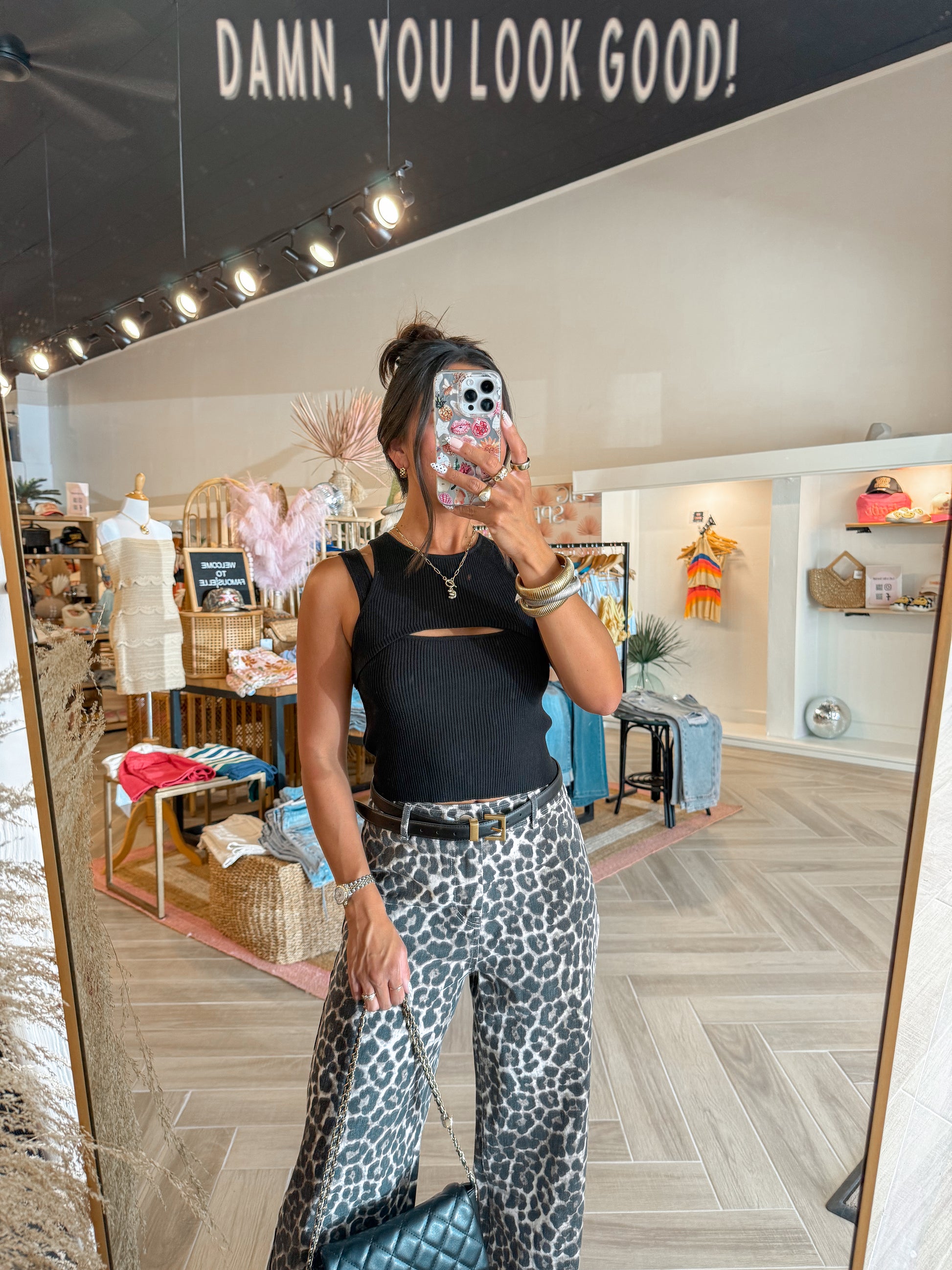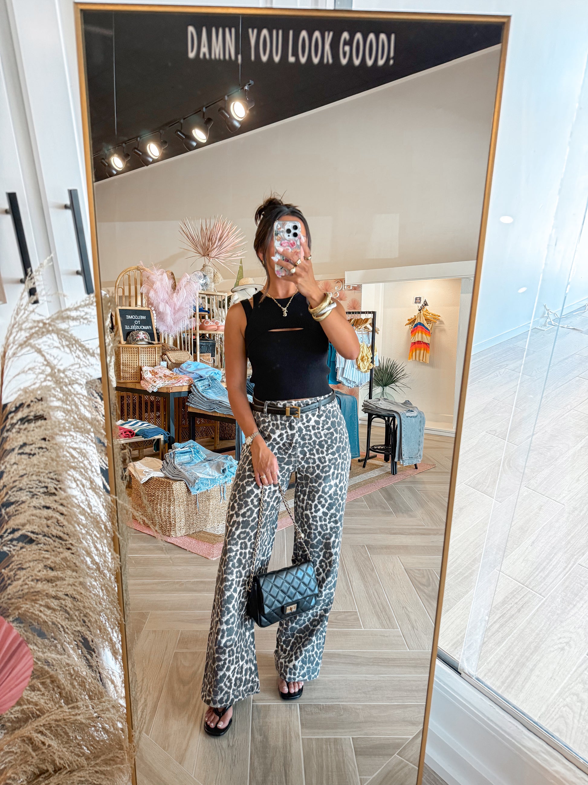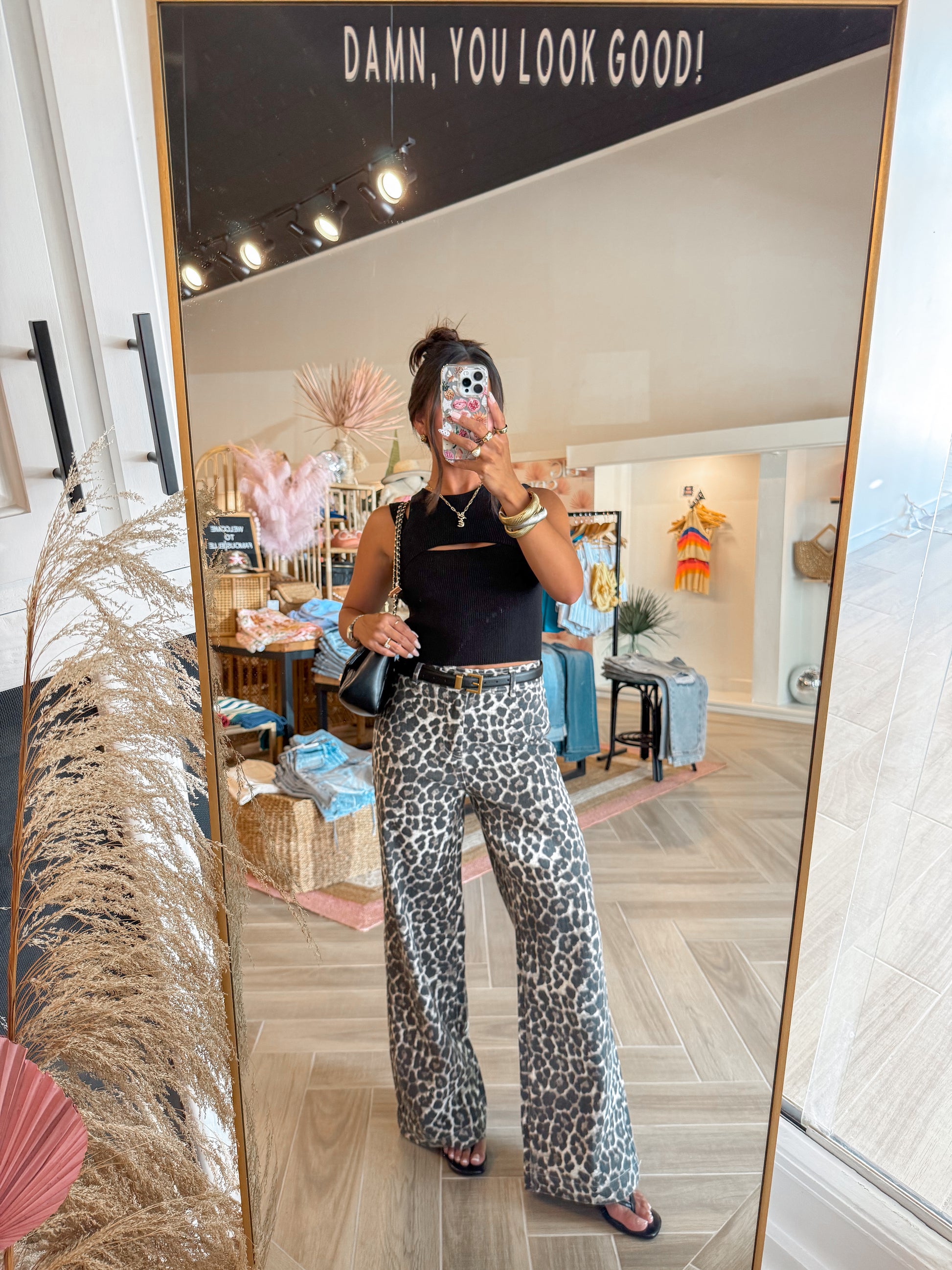 - Leopard wide leg denim jeans