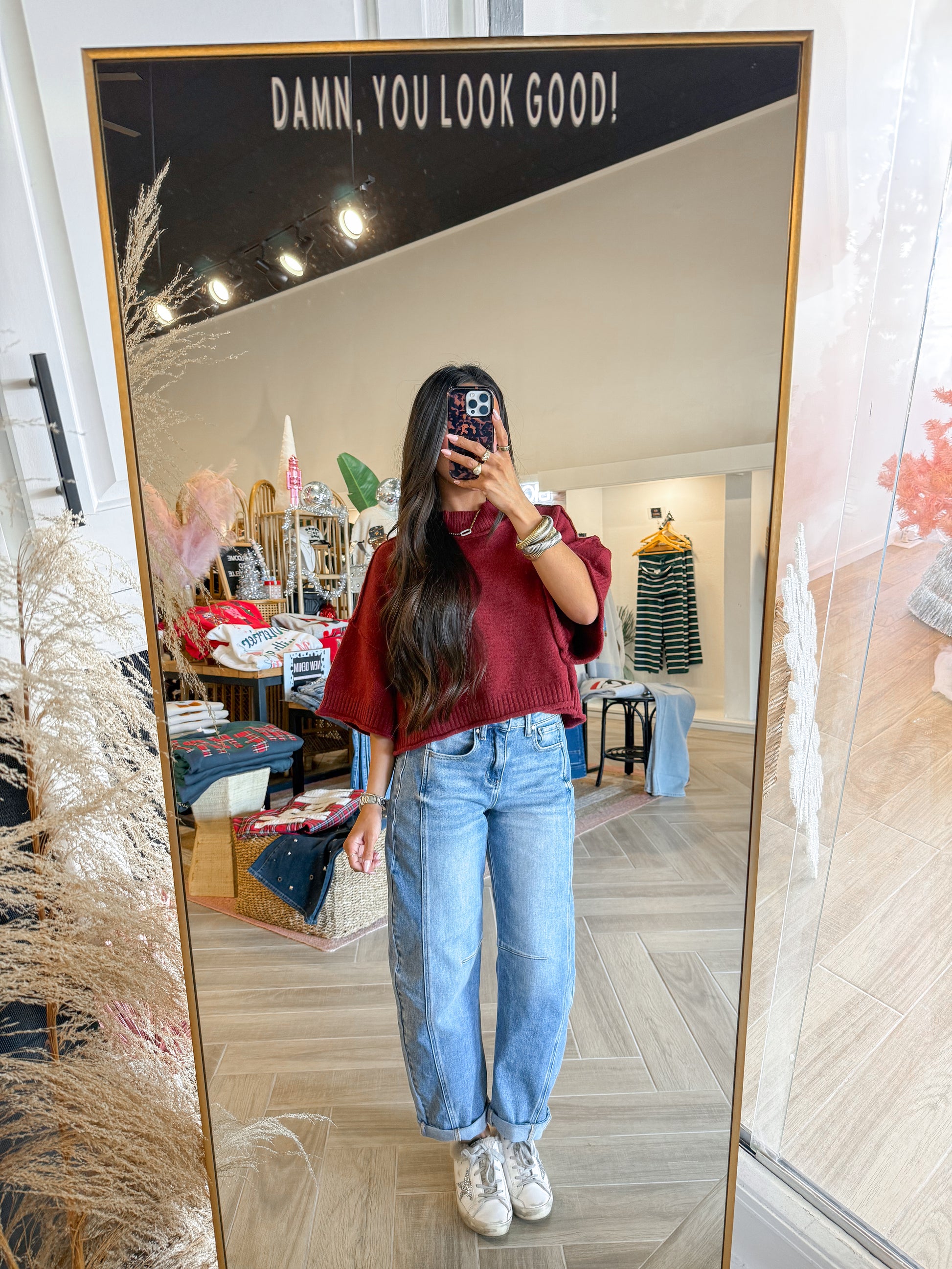 - Mock-neck knit sweater